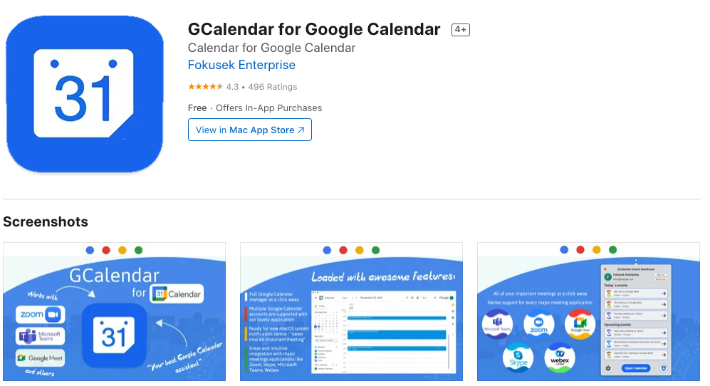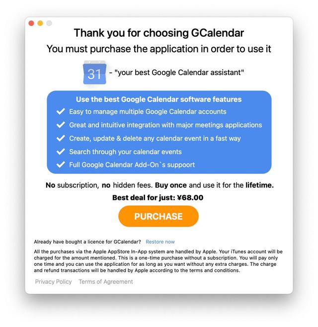 每个人都可以从App仓库免费下载程序。但是,在用户通过使用程序购买购买许可证之前,不可能使用它。除非你这样做,否则这不会起作用。它甚至不为用户提供试用期。Google 日历创作者的GCalendar 在Mac App 商店也有八段内容,