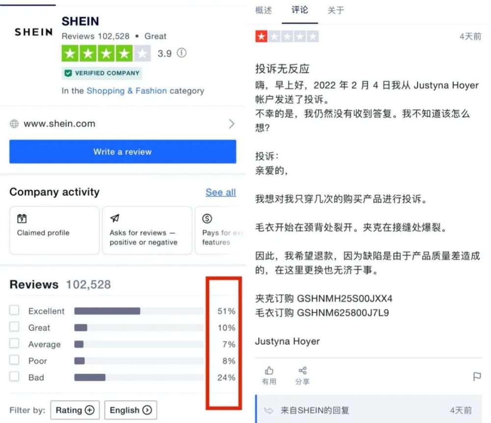 在多数情况下,公司有利的评价应该显示增长或下降的趋势。 SHIN收到了一些关于产品质量、物流和售后服务的投诉。