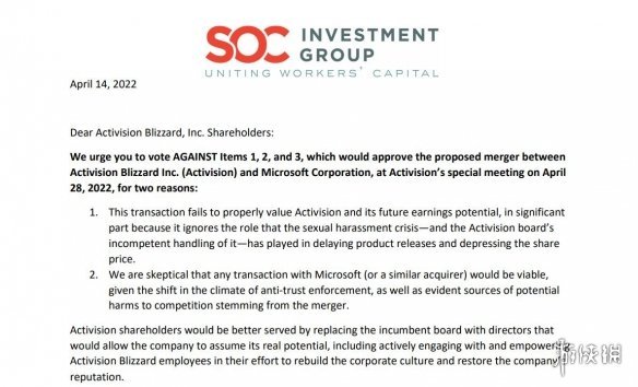 SOC集团强烈建议动视暴雪股东投票拒绝微软收购案!