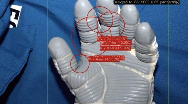 在数据集培训之后,AI和ML自动手套检查例行程序。当宇航员在太空行走后 脱下太空服时他们给宇航员手套拍照这些照片将迅速发送给国际空间站的HPE空间载人计算机-2(机载计算机-2)。