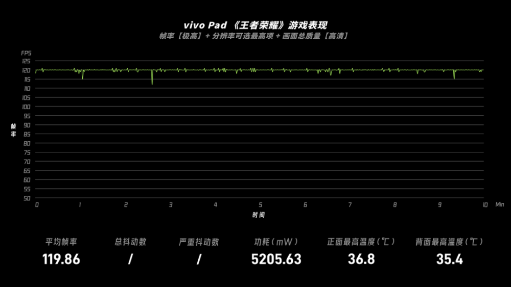 由浅入深,现在,看一眼国王的荣耀 每秒120个框架游戏仍然很容易玩。大部分航程以每秒120个框架完成。最后平均框架费率为119.86fps。飞机后方的温度也是35.4摄氏度。整体表现非常优秀。