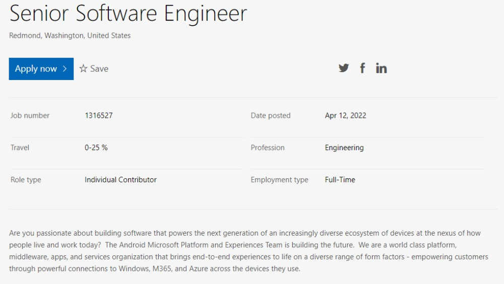 在这份职务说明中,微软声称, “Android 微软平台和经验团队正在塑造未来。”我们是世界级平台、中间人、应用程序开发商和服务供应商。端对端的经验可能有许多形式- 通过与 Windows、 M365 和 Azure 的紧密连接支持客户。 我不知道我该怎么办 。