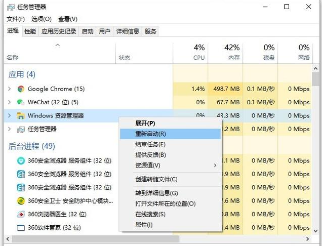 3 下一步,在任务管理器中, 定位 Windows 资源管理器, 按右键重新开始 。
