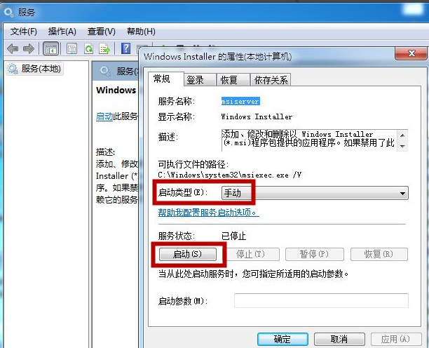 当我们看到属性界面窗口, 我们看到启动类型选择, 我们选择手动, 服务状态选择启动 。