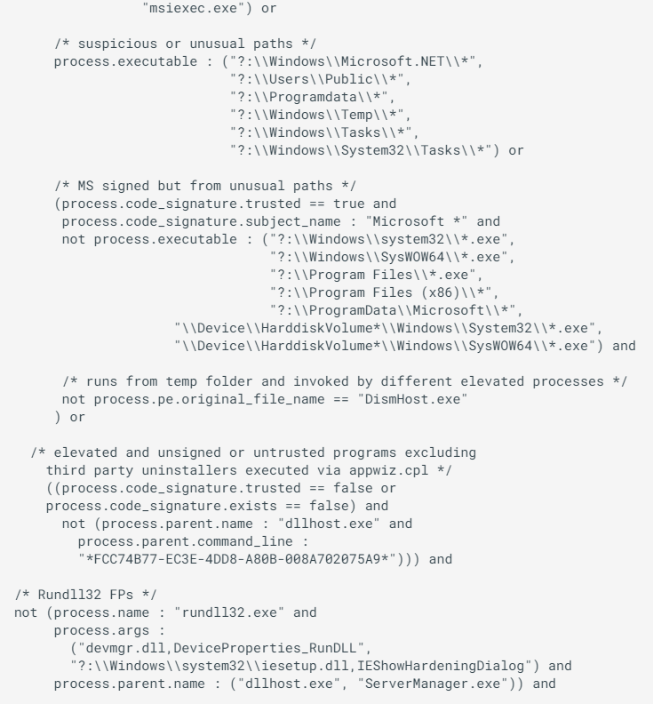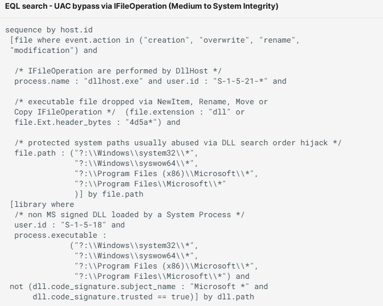 我们可以使用以下 EQL 附加装置将任何文件连接到 dllhost, 然后将没有 Microsoft 签名的 DLL 装入系统完整性进程 :