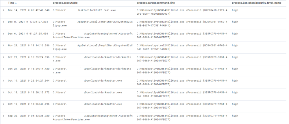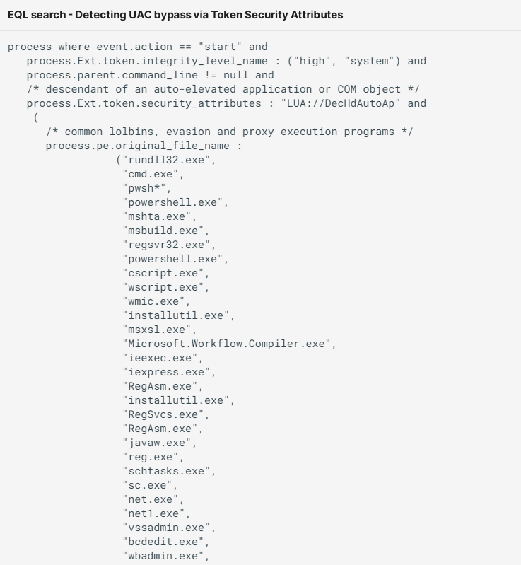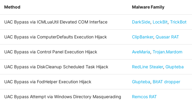以下是一些不同类型恶意软件的例子,这些恶意软件利用这一战略来避免UAC(例如敲诈软件家庭DarkSide和LockBit),在启动加密和规避能力之前,通过提高完整性是无法避免的: