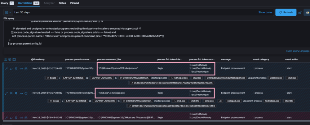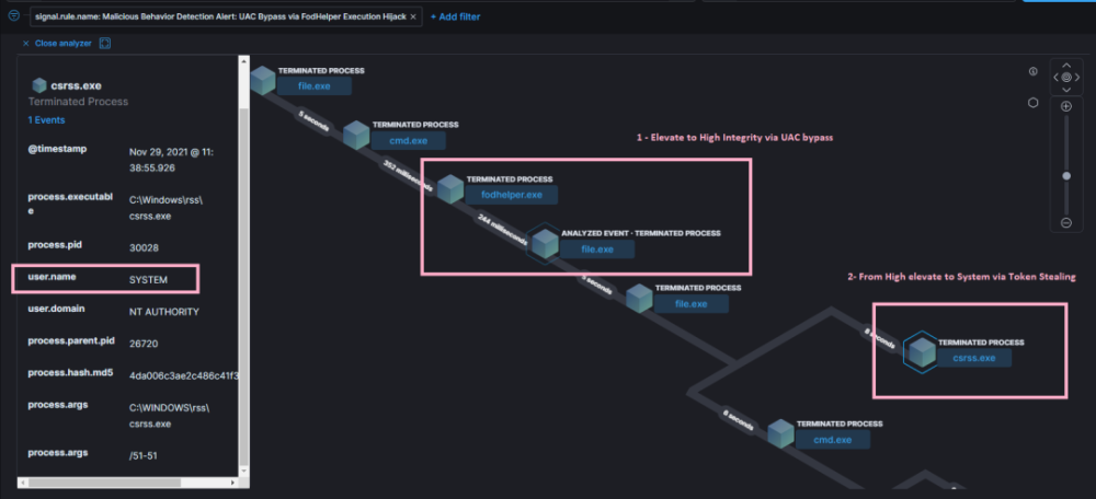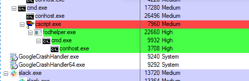 此类型的信息也由 ProcessHacker 捕捉 。 下面是用来绕过使用 Fodhelfer UAC 的启动笔记本板示例的象征性特性示例 。