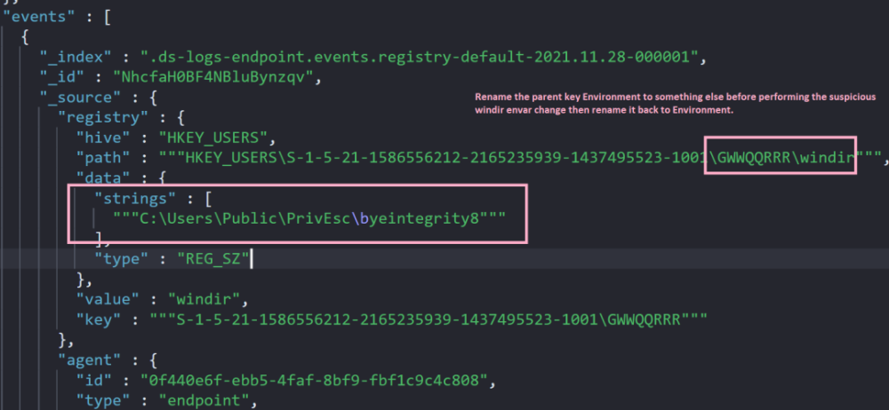 您可以在 Elastic Endpoint 或 Sysmon 日志中查找注册表符号链接的创建, 查找登记表的修改, 其值名称与符号链接Value 相同 。