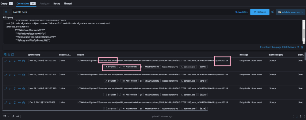 DLL 与DLL劫持有关的文件测试,见日志不是缩微软签名的 DLL, 所以使用 DLL 装载事件( Elistic Endpoint security 7) 16 代替 。对于注册表来说,需要混合注册表。字符串和值名应该比整个密钥路径更能适应。