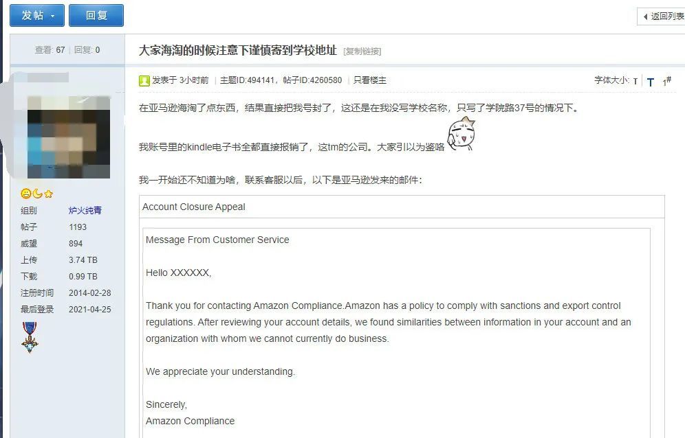 2021年,北京航空和航天大学的一名同校学生声称在亚马逊海,因为他填写了该校的接收地址,账户号码由亚马逊正式封存,他以前在该账户下的所有电子书都丢失了。