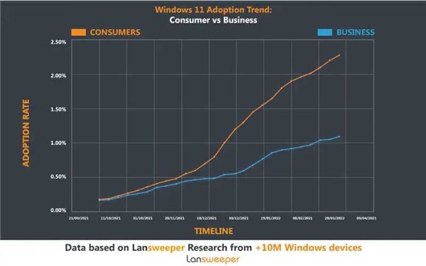 实际上,媒体也错过了Lansweeper的初次报告中Win11企业一级与消费者一级安装率之间的差别。前者是1.1%,后者是2.25%。这基本上是正确的。将工作场所个人电脑升级为Win11的热情和动机大大低于普通人。