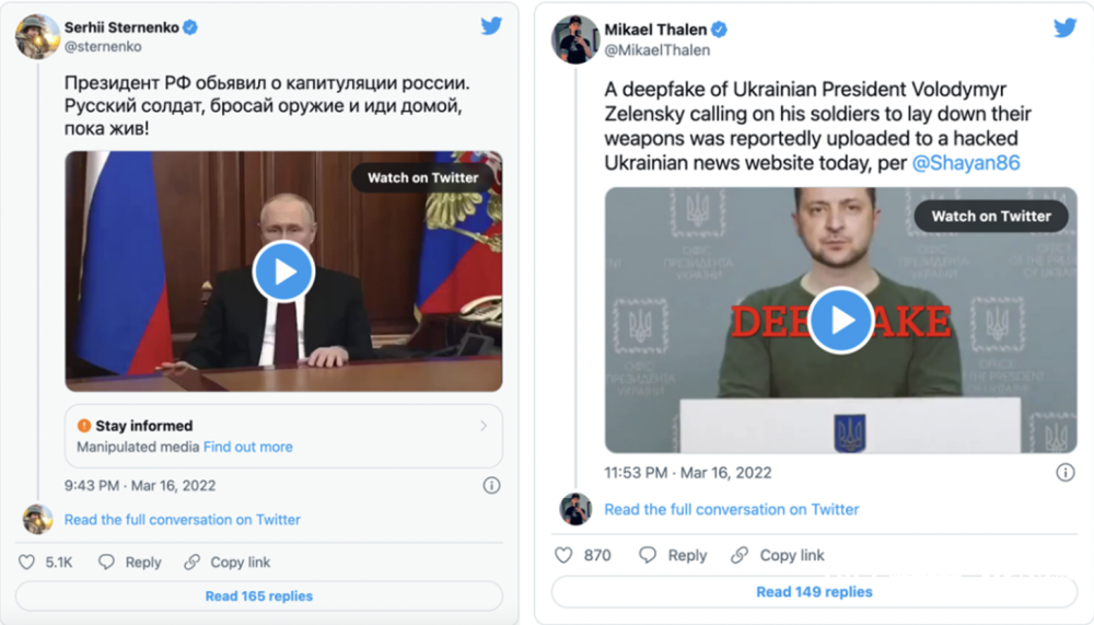 俄乌冲突之下,两国总统的一些假电影也出现在互联网上。据路透社报道,3月,俄罗斯总统普京的视频出现在Twitter上。影片中“Putin”表示, 与乌克兰方面达成和平协议,另一方面,普京直到3月17日才发表同样的和平宣言。这段影片最终被证明是伪造普京2月21日的公开演讲片段。