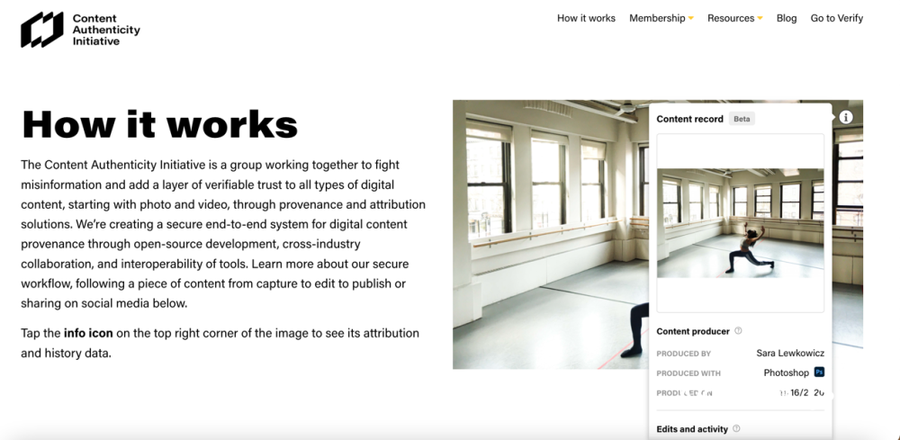 此后,Adobe发布了符合CAI标准的测试工具版本,CAI网络在图像右上角显示 " i " 图标,用户可以读取数字材料的归属和历史数据。