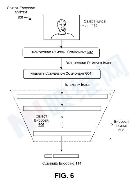 图6显示了物体编码系统106的例子。物体编码系统106是作为一套运行管道建造的。背景首先确定对象图像112中的参考项目,然后删除602部分。并删除不属于引用对象的对象图像 112 中任何背景元素。此方法生成没有背景的图片 。在本例中,上面提到了人体的面孔