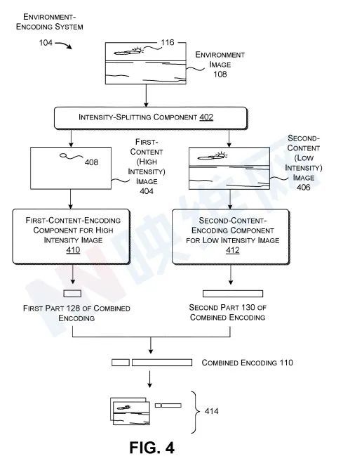 图4显示了环境编码系统104的成就之一。强力分割构成部分402是环境编码系统104的一部分。它使用环境图片108来制作第一和第二内容图像404和406。我不知道你在说什么, 子B2部分, 但图404的第一个元素 突出输入环境图像的中等强度值 108 超过L的设定强度阈值。第二幅内容图406强调输入环境图像108的中等强度等于或低于L的强度阈值。我不知道你在说什么,第b.2分节。