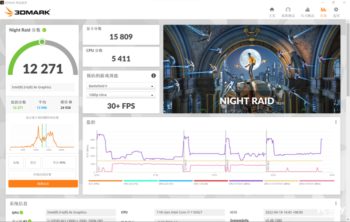 i7-1165G7卡在3D Mark试验方案夜射项目试验中获得高分15809,显示有核电。