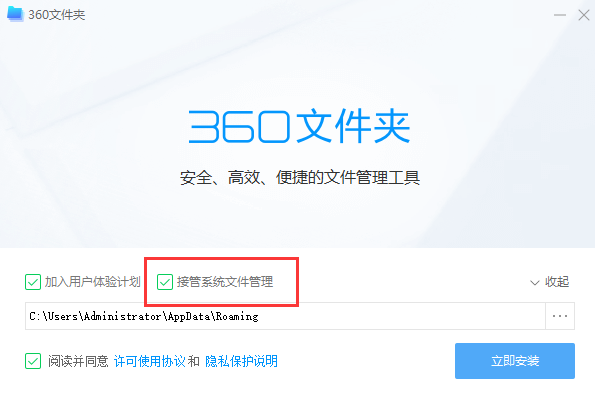 安装后,您可以选中该框以接受系统文件管理,这意味着任何文件夹稍后都将使用360个文件夹访问。