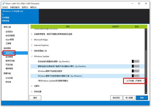 启动 Dism++ 后, 转到控制面板- System 优化窗口更新, 并从子工具上启用自动 Win10 系统更新 。