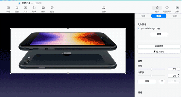 这时,你只需选中图片,点击右侧「格式> 图像> 即时 Alpha」,然后选中图片中白色的部分,就可以把手机抠出来了。