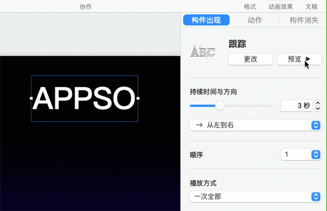 在动画效果底部有一个与PowerPoint动画板相对应的特征,叫做“构造顺序”, 你可以设置动画的序列和触发器, 如果在基调中添加一个复杂的动画, 效果会更好。