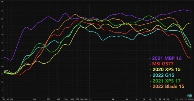 其优势在于外部声音质量,将MacBook Pro 16 (2021年)的音质与微星 GS77、XPS 15、G15、XPS 17和桑德博尔特 15等高端视窗版本的声质作比较,使用一种对中低音量进行量化的频率工具。