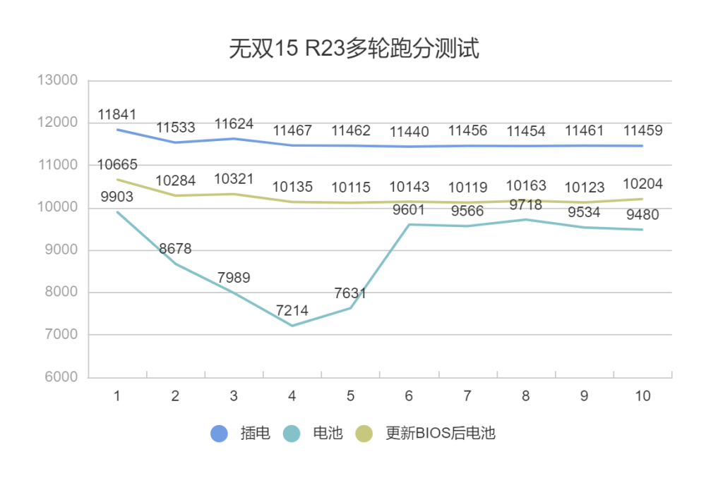 我在CineBnch R23分别用插件和电池模式进行了10轮连续的多核分数测试。 取得了以下结果,实现45W的能力可以稳定地以插件模式提供。