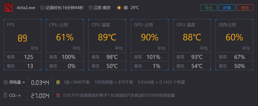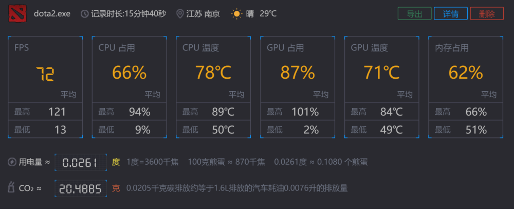 在电池模式下,框架速率大大降低,平均达到72个框架,但框架速率仍然很顺利,可以享受DOTA2的乐趣。