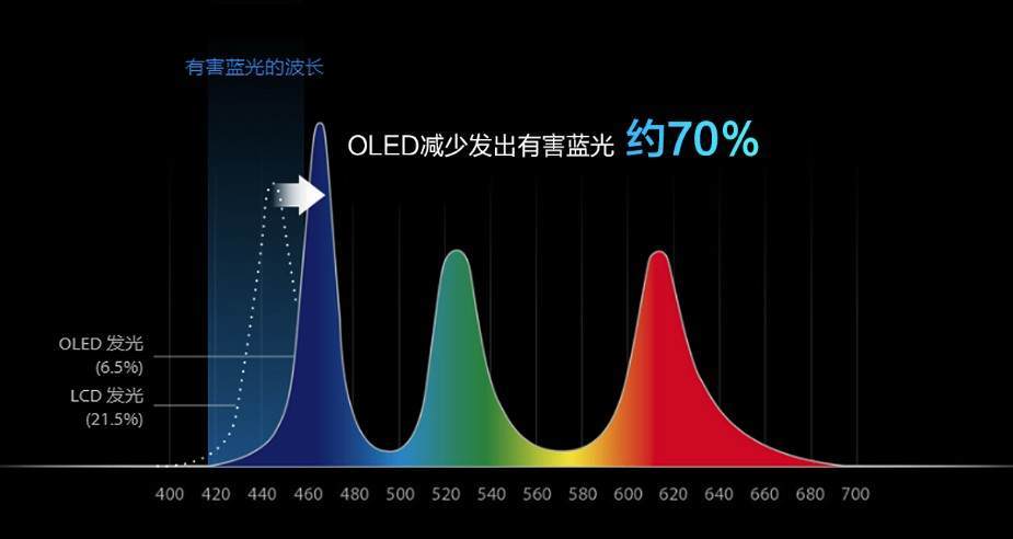 这个OED屏幕除了显示和平滑外,还是一个眼罩。通过优化发光材料,这个OLED蓝光峰的波长比普通液晶屏幕长。损坏的短波蓝色光灯减少70%。做到硬件级防蓝光,近年来,若干当局能够提供眼睛保护,例如SGS低蓝眼睛保护、T-V硬件级低蓝灯等。蓝灯保护比标准软件更为关键。硬件在暴露于蓝色光时不会将图像变成黄色 。眼睛的颜色仍然正确,充满活力。