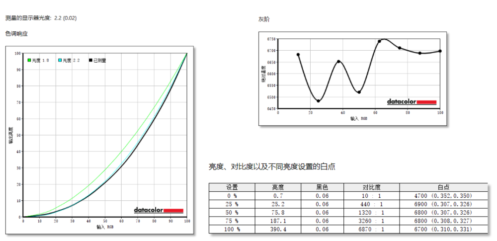 伽马曲线与标准线2.2的曲线密切相关,更精确。色温管理非常有效。在最大和最低亮度之间颜色温度在250K到250K之间同时,正常模式显示的最大亮度为390吨(未启用《人类发展报告》选项)。对比度尚未达到6 870。标准液晶屏幕仍设为100-1500