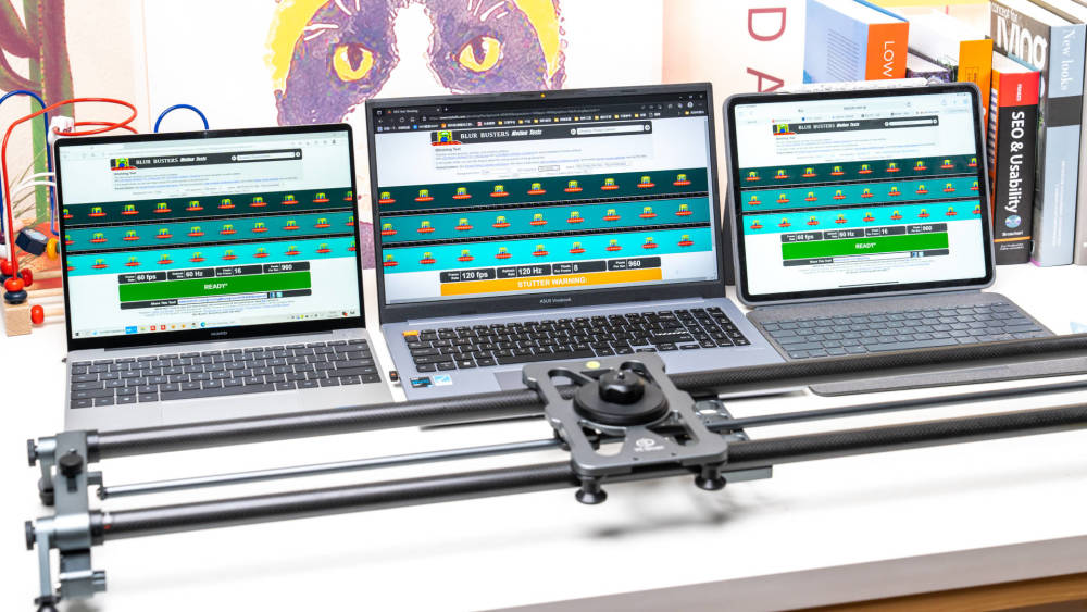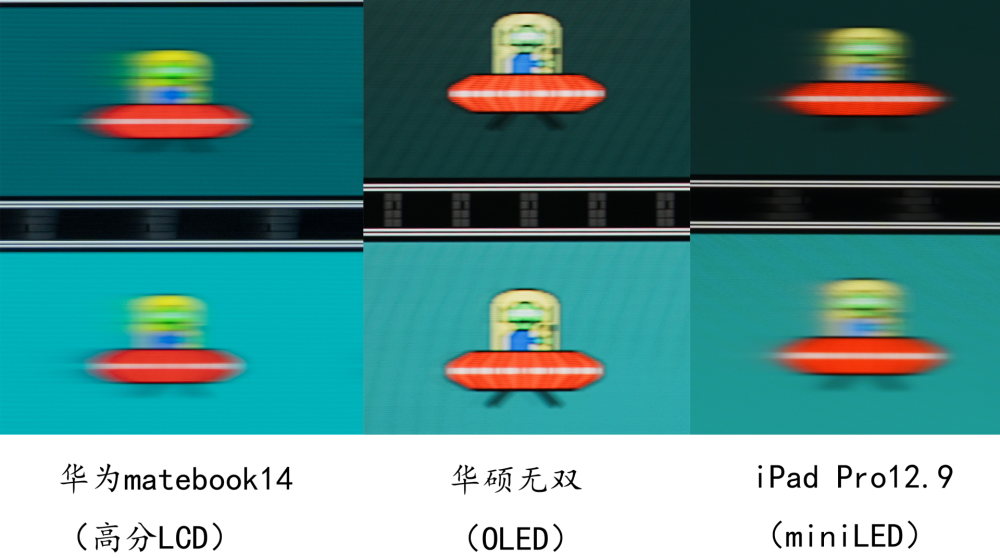 但是,LED赢过标准的LCD和MiniLED以及项目结果的结果非常令人着迷。正如你可以看到的,只有小的飞行磁盘在显示器上更加明显。液晶偏转速度限制液晶屏幕的大小(iPad也是液晶屏幕)。拖影非常明显,像这样拖曳会降低刷子率的丝质 。也就是说,在双层 OLED 面板上,高刷+低延迟时间平滑。
