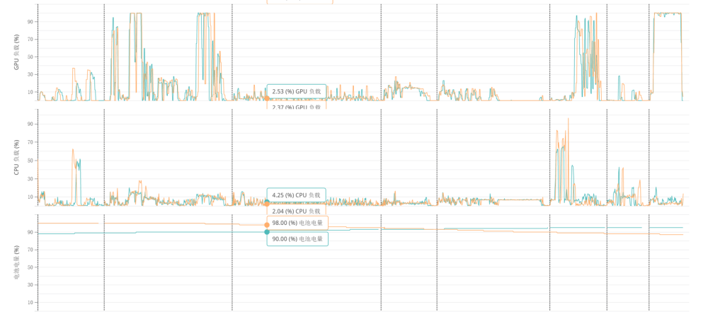 看看上面的进度表和负载图, 插件和电池模式一般的性能没有多大差别。