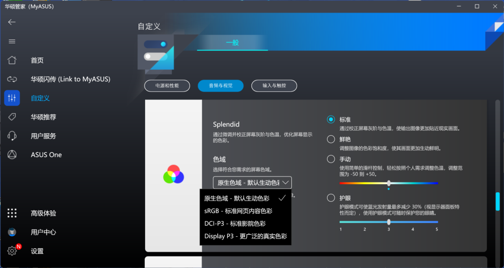 如果您有额外的颜色域要求, 您可以在 MyASUS 中激活另外三个颜色域配置文件 。SRGB适用于网站或监测因特网内容。DCI-P3标准适用于电影业的严格内容监测。在苹果生态学中,显示P3适合于内容监测。