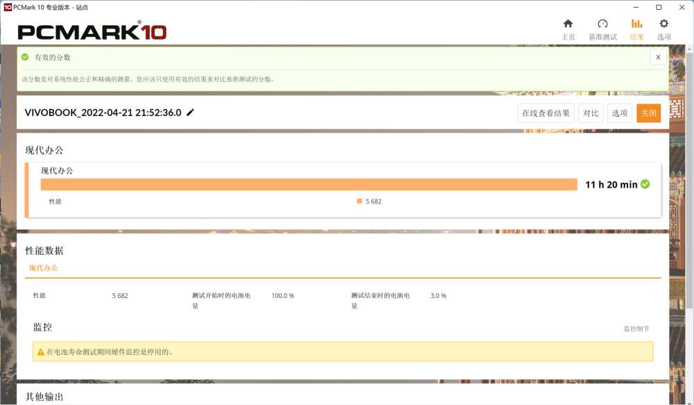 最后,让我们讨论更新和计费问题。中国的电池量为70瓦,电池大小为70瓦。这是首次使用PC Mark10来评估正常办公环境中的飞行持续情况。测试中,屏幕设定为 40% 亮度 。电池选项为高效,风扇设置为静音,然后切换到暗色模式, 使 OLED 屏幕的电量更少 。我很久没明白我在说什么了 我意思是 我不确定我11小时20分钟内能做得到坦率地说,增加70小时是最后一刻的决定。