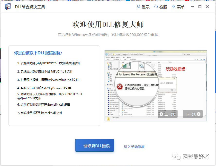 DLL 综合解决方案工具是一个跨平台的全功能修复程序,解决了各种共同的计算机问题。应用程序无法正确启动 。Nvidia安装软件无法继续运行。系统奔溃,软件打不开,程序错误,不可能开始一个困难的议题。可悲的是,修复一个关键要花很多钱。