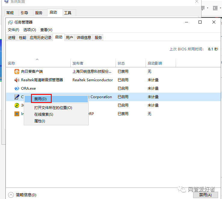 2. 切换到启动标签,在启动项目中查找 " curl " netsh " 名称,选中它,单击确认,然后重新启动机器。