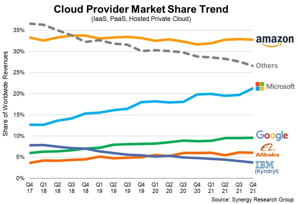 与此同时,在公有云赛道上,微软Azure是世界上第二大云制造商。世界市场份额正在增长。仅次于亚马逊。根据合力研究的一项研究自2017年年底以来微软的市场份额增加了9个百分点以上。在2021年第四季度,全球市场份额达到21%。亚马逊、微软、谷歌、阿里和IBM是全球五大云基础设施服务提供商。