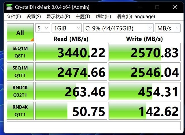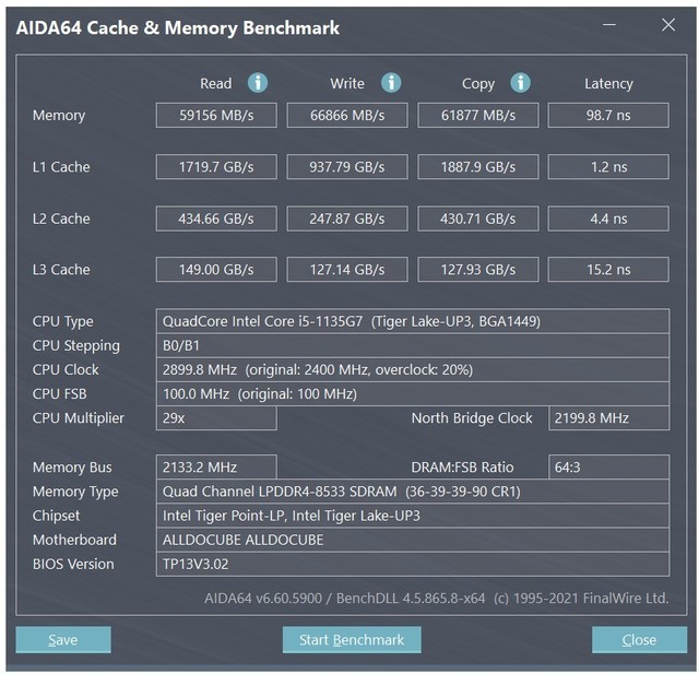 内存方面,iWork GT 拥有来自立方体的16GB LPDD4X 4267兆赫内存。性能非常强劲,读数速度达到59156 MB/s。最大写作速度为66866 MB/s。生殖率为61,877甲基溴/秒。然而,时间序列并不相同,因为它是36-39-39-39-90-CR1。所以延迟表现一般,为98.7ns。