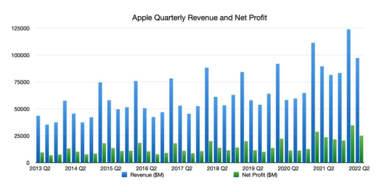 从各分项业务来看,俄罗斯联邦的冲突和供应链也很少注意关键产品系列的销售。iPhone货物收到505美元,价值约7亿美元。这增加了5.5%;麦克收入现在为1.044亿美元。这增加了14.73%;iPad收入为7 650万美元。这减少了1.9%,服务收入共计2亿美元。这是17.28%的增益。