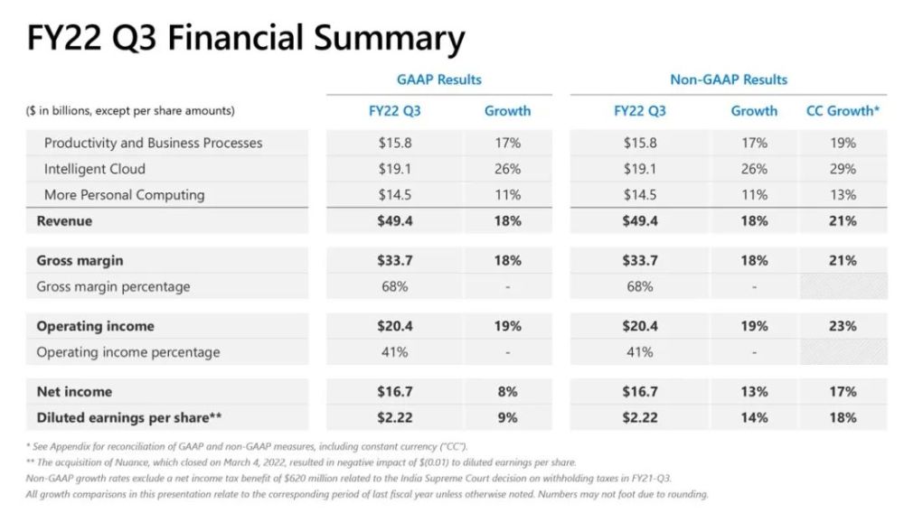 在暴风雪之后,微软公司提交了2022年3月31日终了财政年度的Q3报告,达到两位数增长:总收入达到494亿美元,比同期增加18%,净收入167亿美元,比同期增加8%。