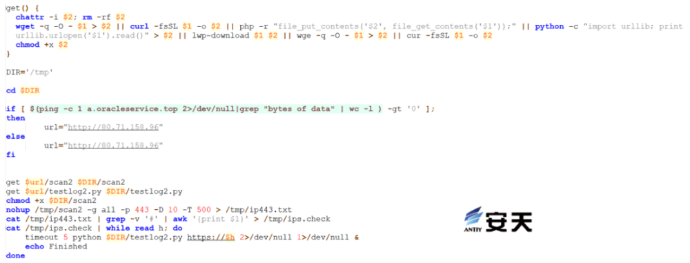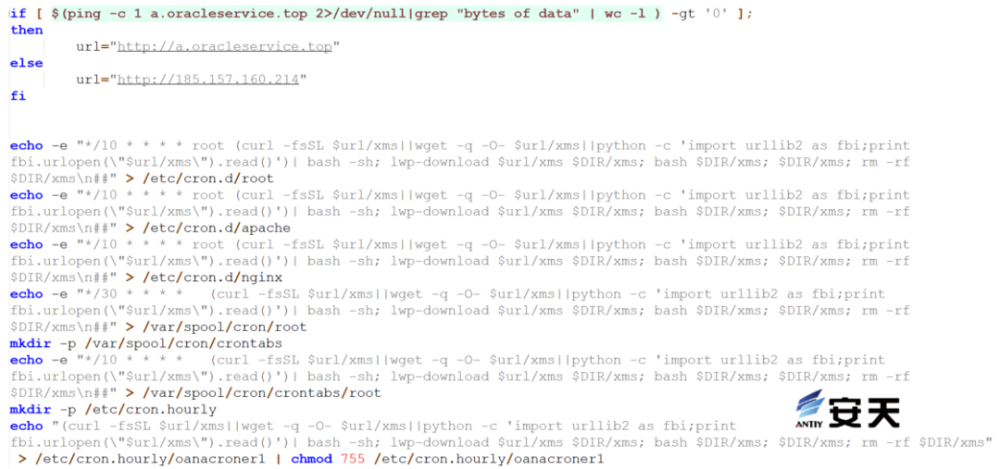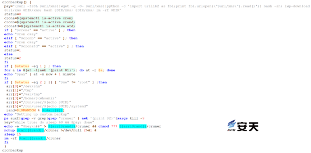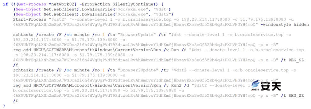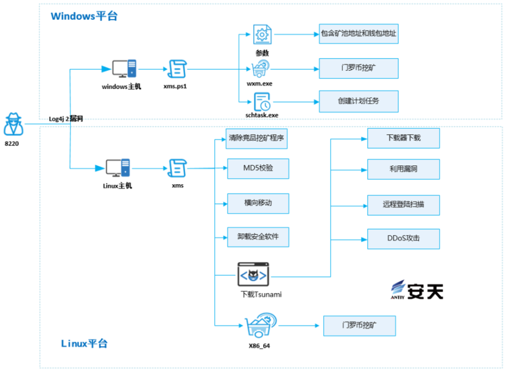 8220使用“ xms” 的名称。"主要函数由 Powershell 脚本 ps1 执行。这是采矿应用程序“wxm”的下载。采矿软件是开放源码门罗采矿方案XMRIG的一部分,该方案包括关闭防火墙、关闭竞争性采矿进程和隐藏采矿环境。将坑地址链接到钱包地址,并将启动条目输入到排定的工作和登记表格中达到持久化目的等。在Linux平台上,主要功能是由一个名为“xms”的空壳脚本执行的。具体职责包括优化系统资源的使用、关闭防火墙、关闭竞争者采矿程序、卸载安全软件、创造计划工作的可持续性、完成MD5采矿程序核查、下载海啸僵尸网络程序和挖掘程序、收集主机识别信息供横向移动。海啸僵尸网络方案的主要目的包括遥控、DDoS攻击和其他破坏性行为。