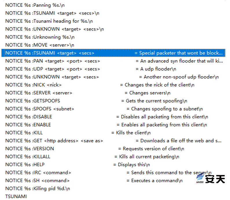 海啸僵尸网络应因特网中继聊天(IRC)的要求运行服务器。在受影响的设备设置中修改 DNS 服务器设置 。袭击者将物资网络设备改道流向恶意场所。海啸僵尸网络主要通过下载、利用缺陷、远程登录扫描和其他手段传播。海啸僵尸网络方案的主要目的包括遥控、DDoS攻击和其他破坏性行为。Antxil主要关注海啸僵尸网络和“嘲笑”行动,这里不会出现过度分析[1]。
