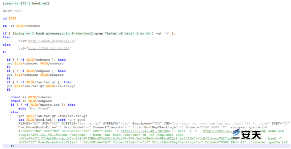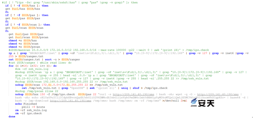 应使用扫描工具在22个端口炸毁内部网络,并将结果记录在/tmp/ssh_vuln.org.txt文件中,然后过滤到/tmp/ips_ check文件,下载xms(Linux恶意脚本)并执行。