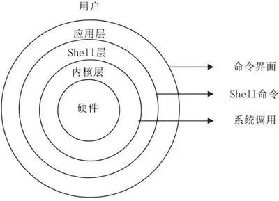 UNIX/Linux系统可能大致被抽象为三个层次(所谓的粗糙、粗糙、粗糙)。根本不够彻底或准确尽管如此,初学者很容易理解其优先事项。如下图所示。UNIX/Linux操作系统是最低水平。贝壳层在中间这是命令级别的解释;申请级别更高。