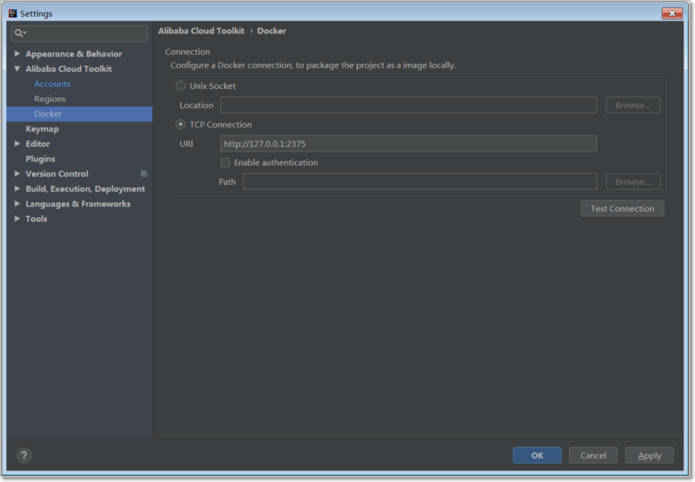 当地是Windows操作系统,检查TCP协议,然后将Docker本地 URI放入URI右手文档框,例如http://:2375。