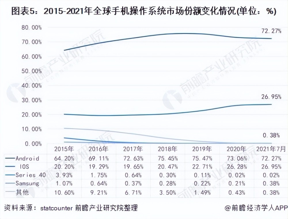 Adroid、iOS、Series 40、三星和其他主要产品主宰着全球移动操作系统产业。统计统计员报告说,2021年7月在世界范围内的移动电话操作系统市场上,Android拥有72.7%的市场份额。它比任何其他操作系统都优越。苹果的 iOS 操作系统在第二位。城市的居住率为26岁,占95%。其他系列40,三星,等等,约占0.78%。