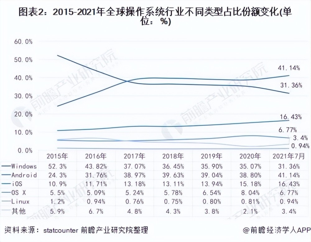 Statcofer 提供的数据显示在全球操作系统市场,Windows、Android、iOS、OS X和Linux是目前可用的五个主要操作系统。随着近年来流动终端市场需求迅速扩大,对移动终端终端的需求激增。Android系统的市场份额正在稳步增加。2017年,Android的市场份额首次超过Windows市场份额。2020年,Android系统拥有38%的市场份额。这是我们对2011年埃及抗议的特别报道的一部分。第二个数字是微软占Windows市场35.7%。2021年7月Android公司的全球市场份额仍然具有竞争力。这一比例已扩大到41.4%。Windows的市场份额下降到31.6%。微软依赖“ WinTel” 与“ 软件付费” 模式结合使用 。Google的商业战略基于“Android+ARM”+“自由流通加上增值服务”。它们合在一起在全球操作系统范围内产生百叶窗。