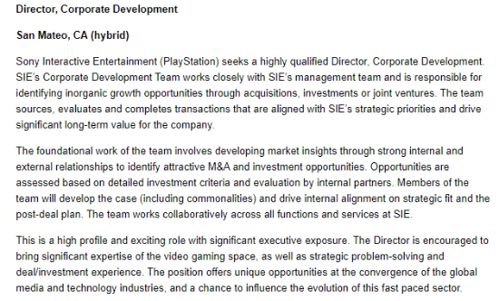 Sony正在寻找一个能够“通过收购、投资或合资企业为企业寻找无机扩张机会”的人,