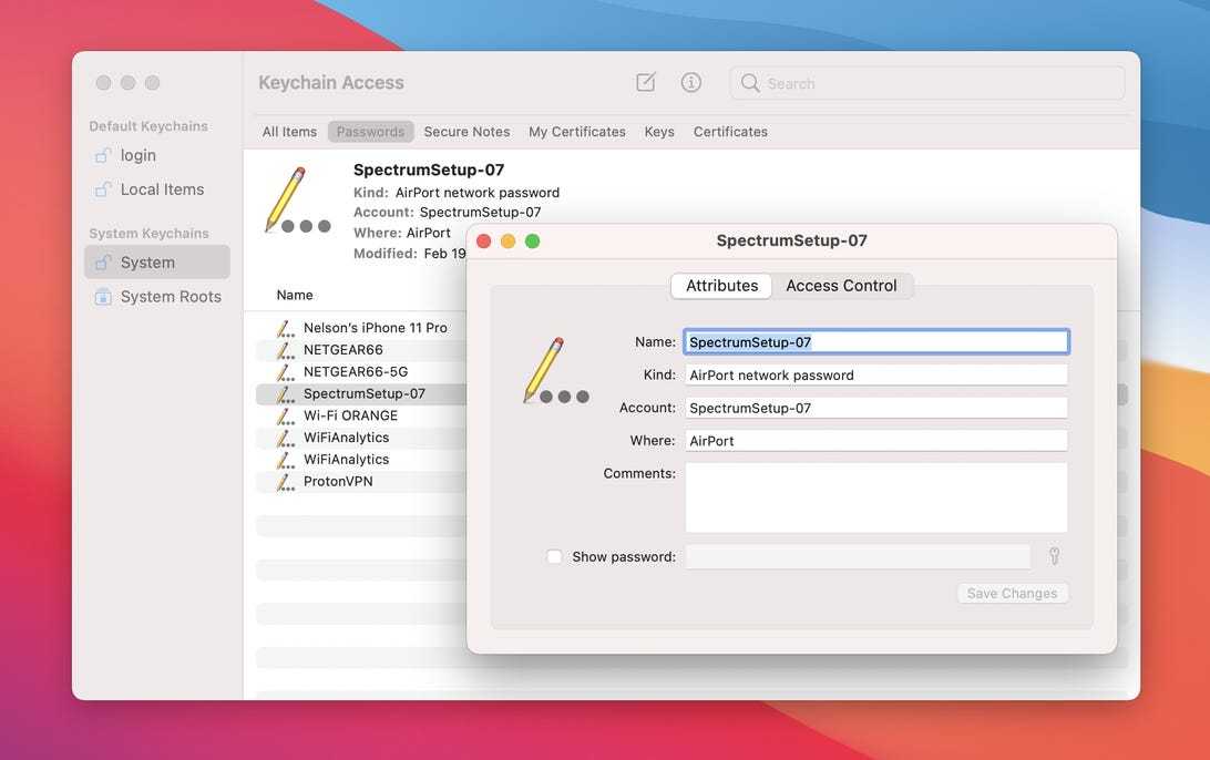您输入并保存的每个密码都保存在 键链存取( MacOS 密码管理系统) 中, 包括 Wi-Fi 网络证书 。
