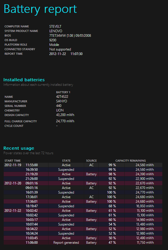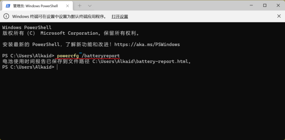 此命令在 C: Users( User) 管理器目录中创建电池报告文件 。