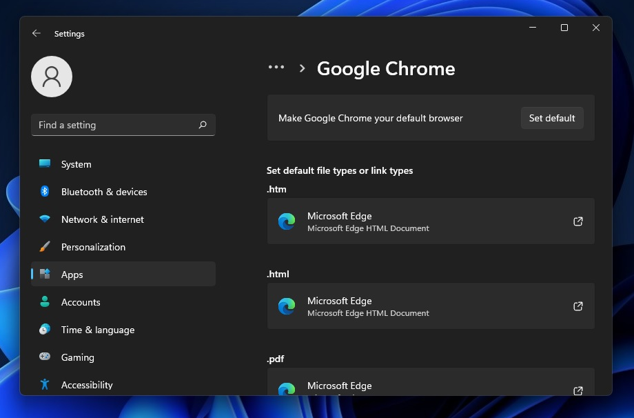 Win11 现在有一个新选项, 允许用户更改所有已知 Web 协议和文件扩展的默认浏览器 。
